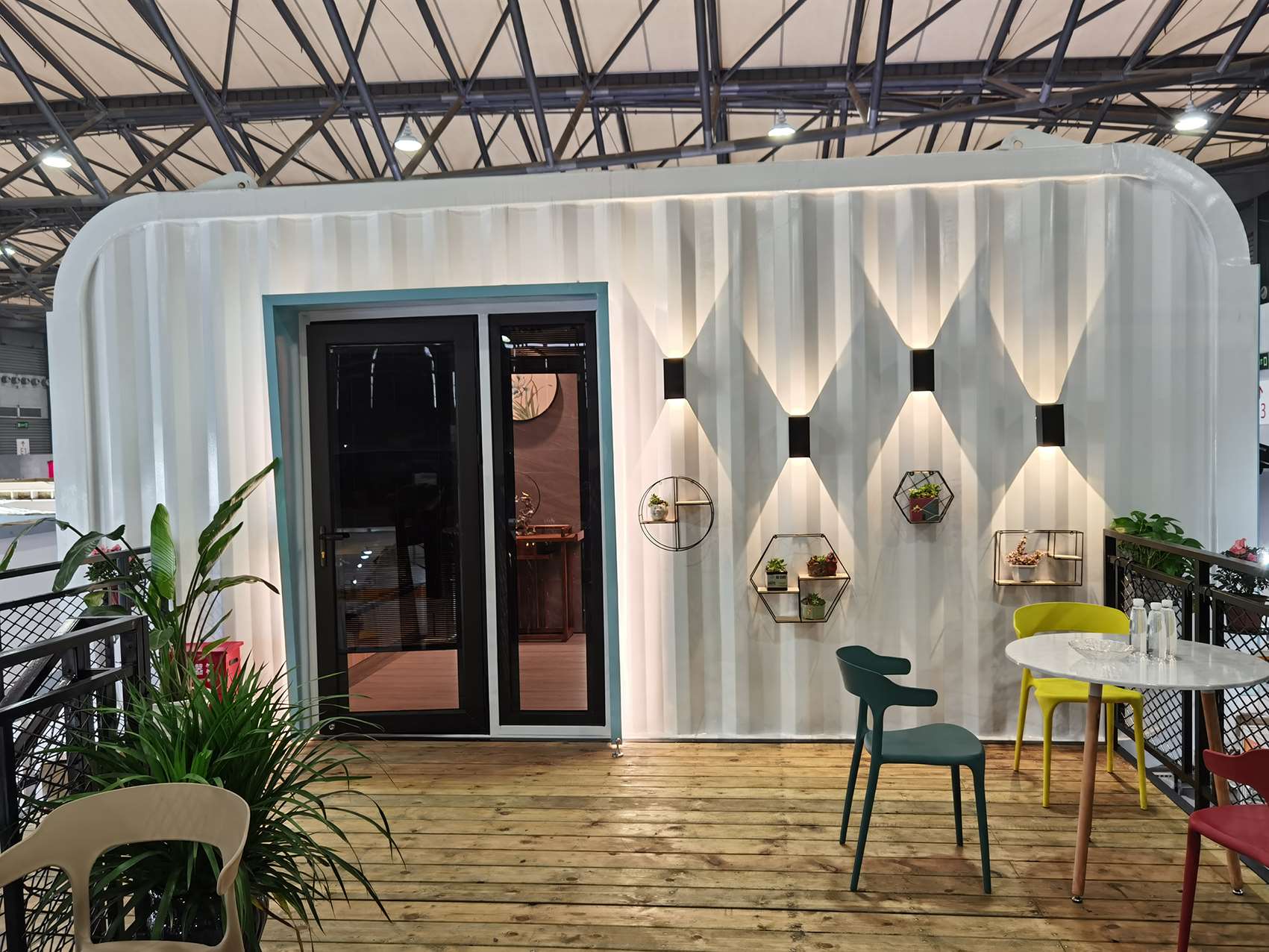 柜族本次參展的產(chǎn)品——逸海小筑位于E2裝配式建筑展區(qū)的2269展位,是一款以藍(lán)白為主色調(diào)、融入了水與波浪元素的海洋風(fēng)集裝箱別墅。該產(chǎn)品的設(shè)計(jì)理念為環(huán)保、舒適、旅居,以不破壞場(chǎng)地與自然環(huán)境為出發(fā)點(diǎn),整個(gè)產(chǎn)品為工廠預(yù)制完成,地面抬高3個(gè)臺(tái)階,有效隔離了地面的潮氣。箱子著力點(diǎn)有圓柱支撐,底座圓盤(pán)加大了受力面積和整體平衡性。箱子整體分為一、二層兩個(gè)模塊,用吊機(jī)和平板車(chē)整體裝卸運(yùn)輸,在選好的平整地面直接擺放就可以入住使用了。